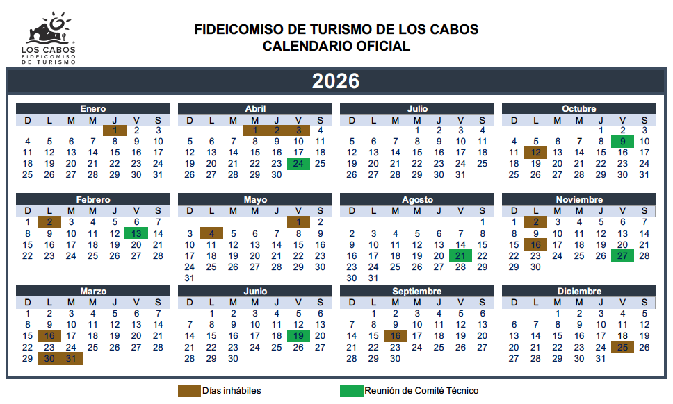 – El Comité Técnico del Fideicomiso de Turismo de Los Cabos, conforme a lo dispuesto en la décima cláusula del contrato de fideicomiso, se reunirá al menos una vez cada dos meses para garantizar el adecuado funcionamiento de sus actividades. Además, podrá sesionar las veces que sea necesario en función de la relevancia de los asuntos a tratar, por lo que el presente calendario está sujeto a modificaciones según los requerimientos de los mismos.